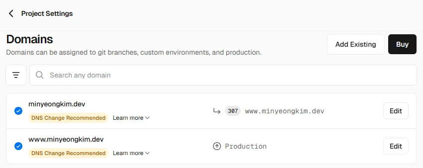 설정 후 Vercel에서 도메인이 정상 할당된 걸 확인할 수 있다.
