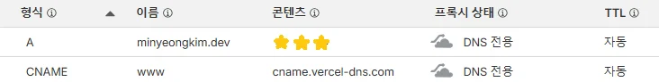 Cloudflare에서 레코드 추가할 때 프록시(주황색 구름 아이콘)는 꺼야 한다. 켜두면 Vercel과 이중 프록시가 되어 SSL 충돌이나 리다이렉트 루프가 발생할 수 있다.