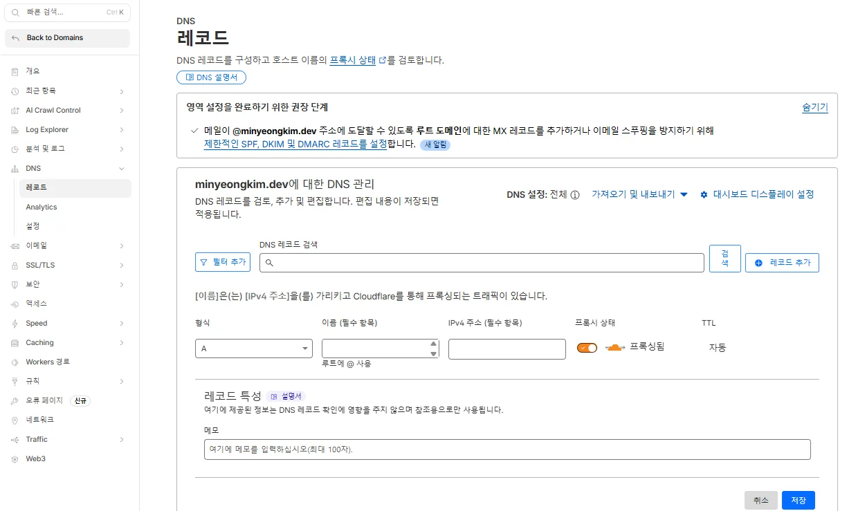 도메인을 구매하면 아래처럼 Cloudflare DNS 관리 화면이 자동으로 생성된다. 여기서 레코드를 추가하면 된다.