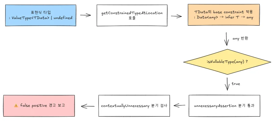 constrainedTypeIsNullable = true—>any는 nullable로 취급actualTypeIsNullable = true—>ValueType<TData> | undefined도 nullable- 둘 다 nullable이므로 첫 번째