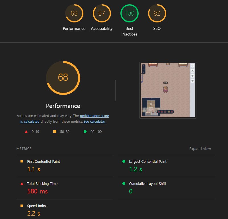 - Phaser (~1.2MB): 맵이 열리기 전 반드시 실행되어야 하므로 초기 번들에서 분리하기 어렵다.
