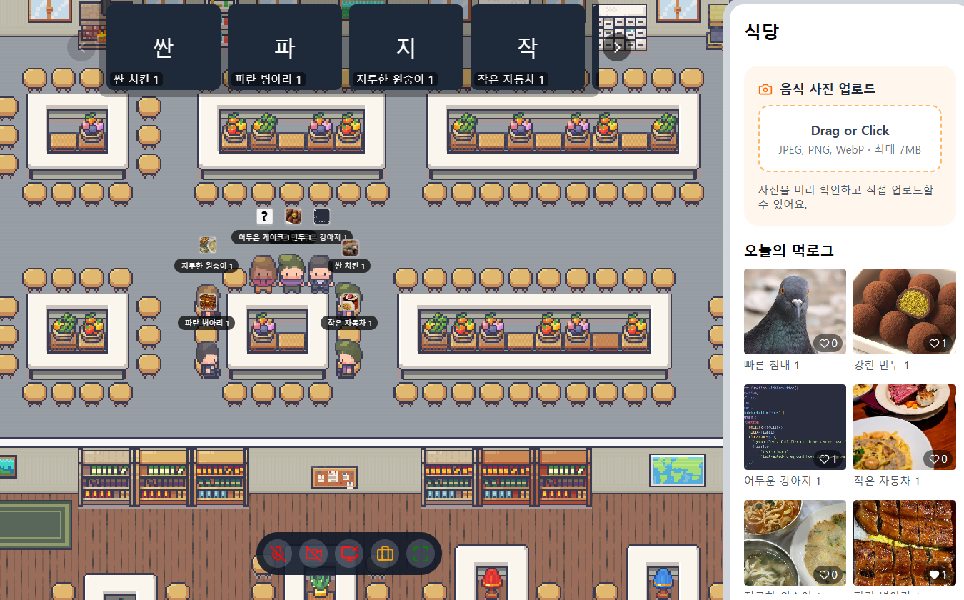 음식 사진을 업로드하면 사이드바와 닉네임 위에 썸네일로 표현되고, 클릭하면 크게 볼 수 있다. 좋아요로 반응을 남길 수도 있다.
